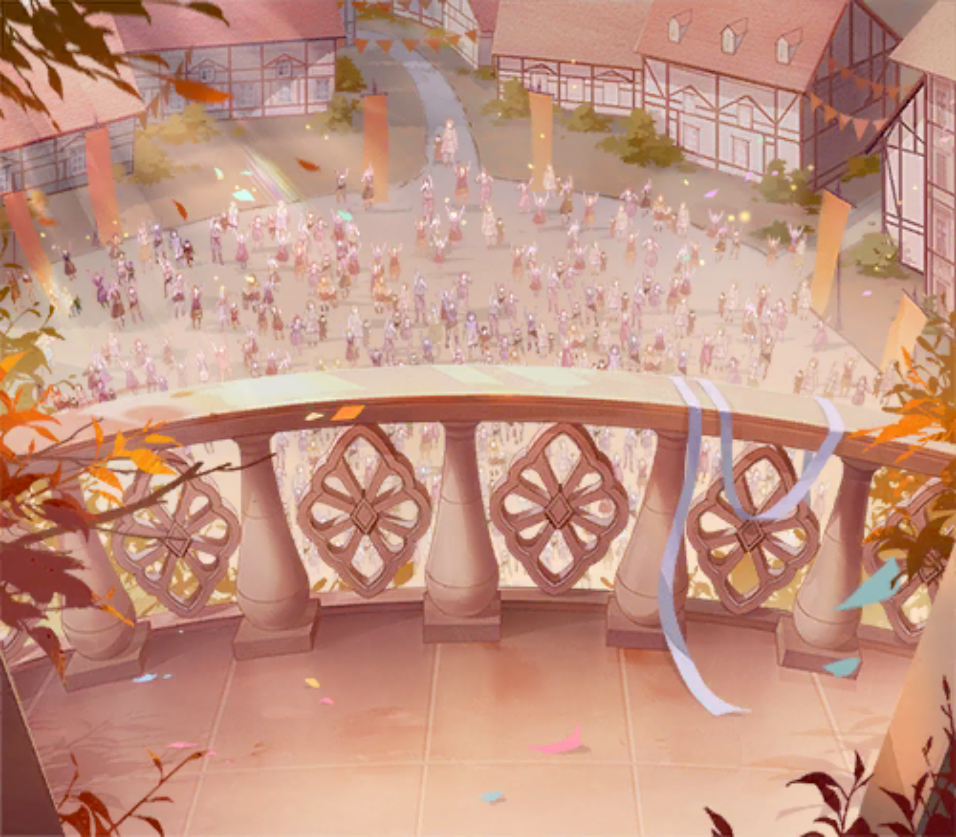 我悄悄探出头,望见露台下方逐渐聚集的人潮。나는 슬며시 고개를 내밀어, 테라스 아래로 점점 모여드는 인파를 바라보았다.