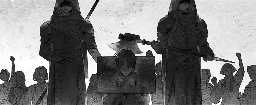 就在这时,路的对侧有一声嘶吼响起。这是又一次的处刑仪式,被处刑者是他曾经的朋友——그때 길 반대편에서 한 소리가 들렸다. 또 한번의 처형식이었다. 이번 처형자는 그가 한때 친구라 여겼던 사람이었다——