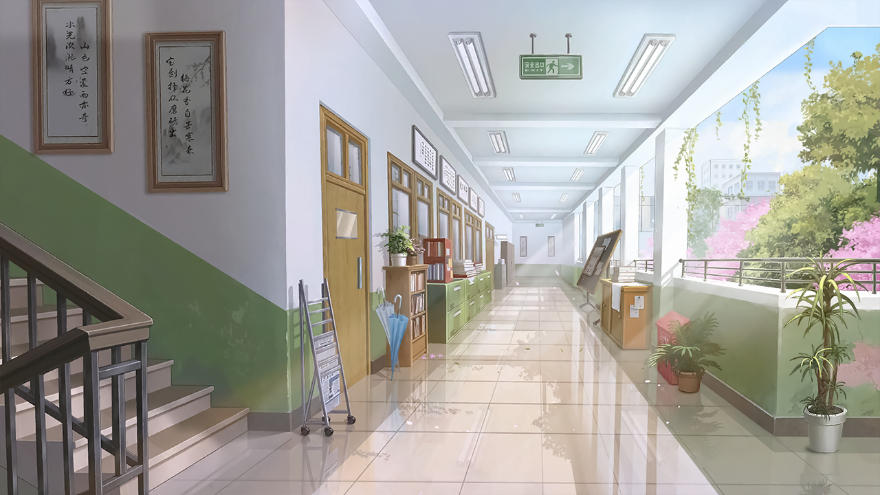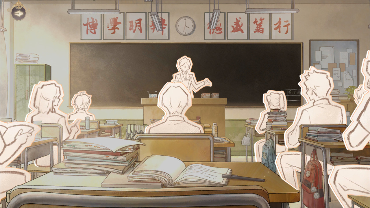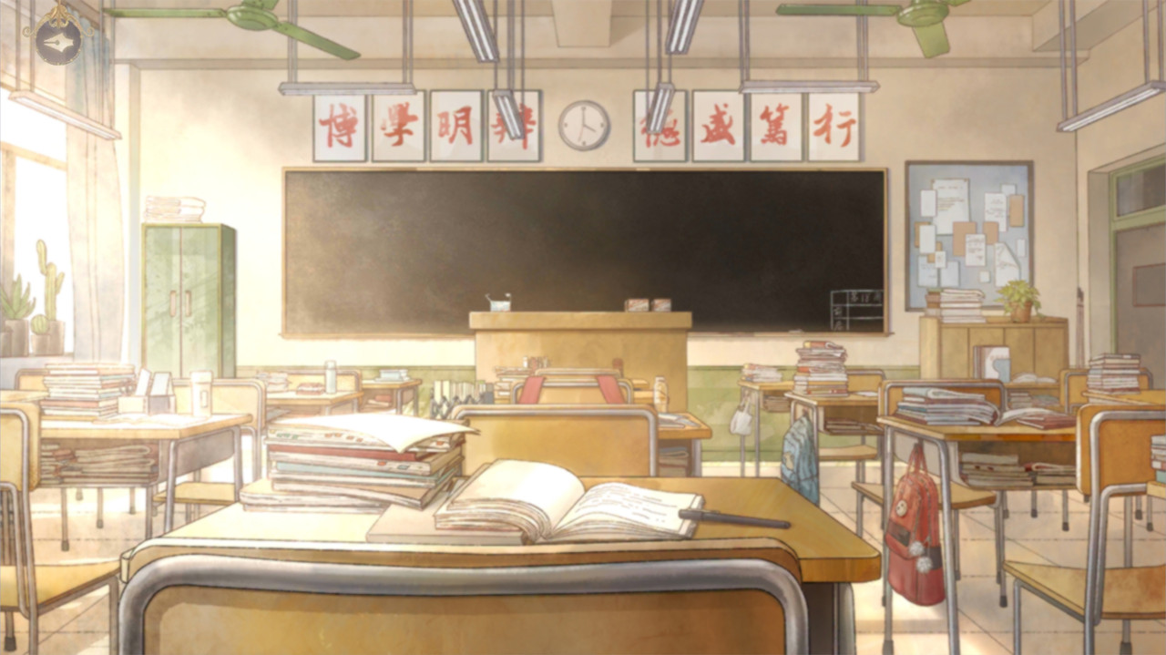 是教室一般的场景,稍显老旧的木质桌椅,于桌上堆叠的书本,还有一旁悄悄冲我竖起大拇指的……同桌?그곳은 평범한 교실의 풍경, 약간 낡은 나무 책상과 의자, 책상 위에 쌓여 있는 책들, 그리고 옆에서 나를 향해 몰래 엄지를 치켜든……짝꿍?