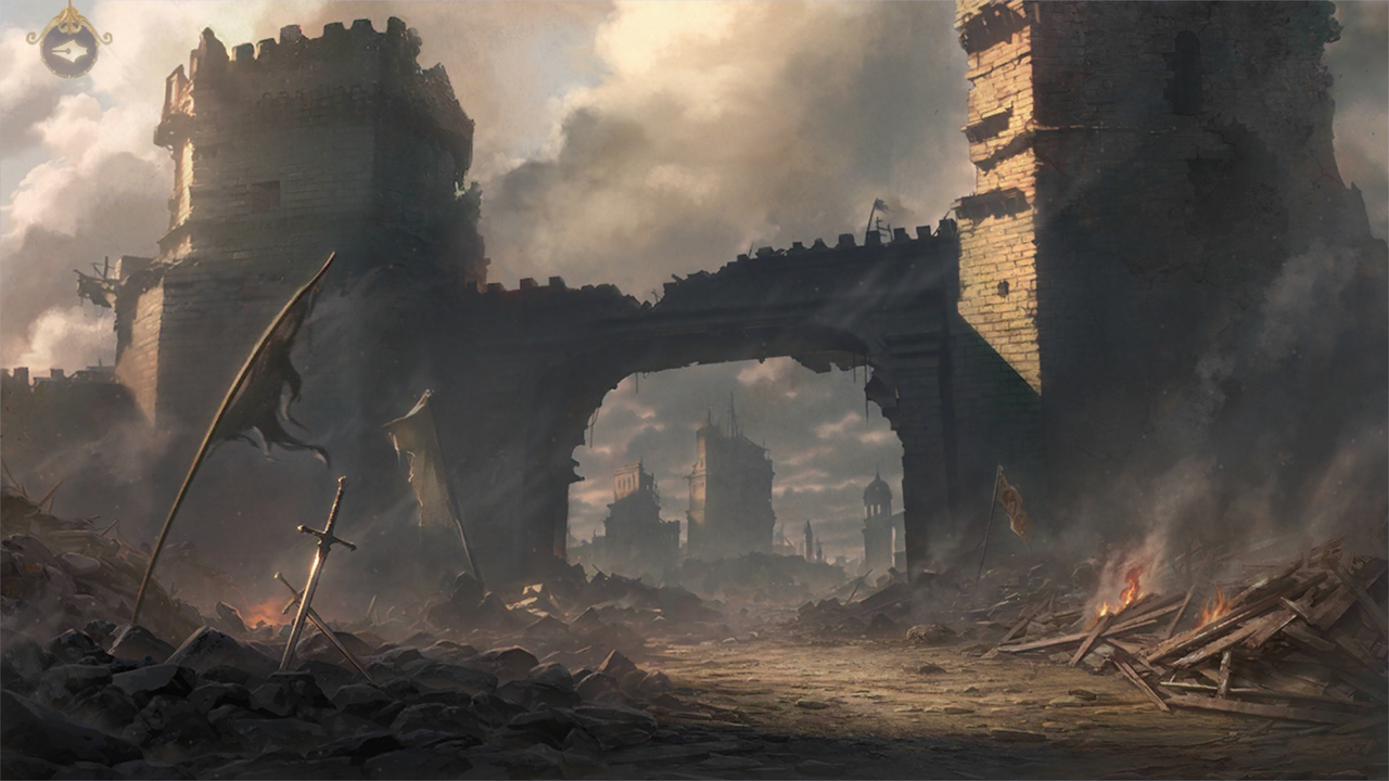 垮塌的城市,燃烧的废墟,路边随处可见的断肢和枯骨。무너진 도시, 불타는 폐허, 길가 곳곳에 널린 절단된 팔다리와 말라붙은 뼈.