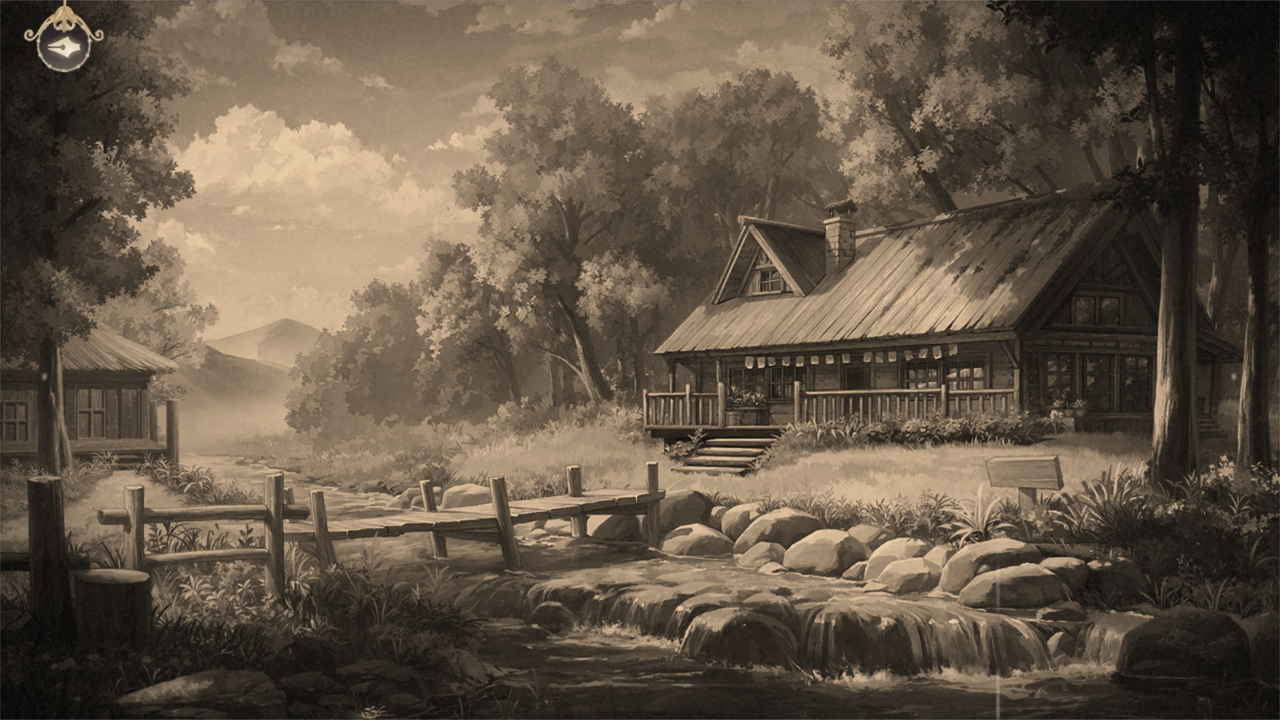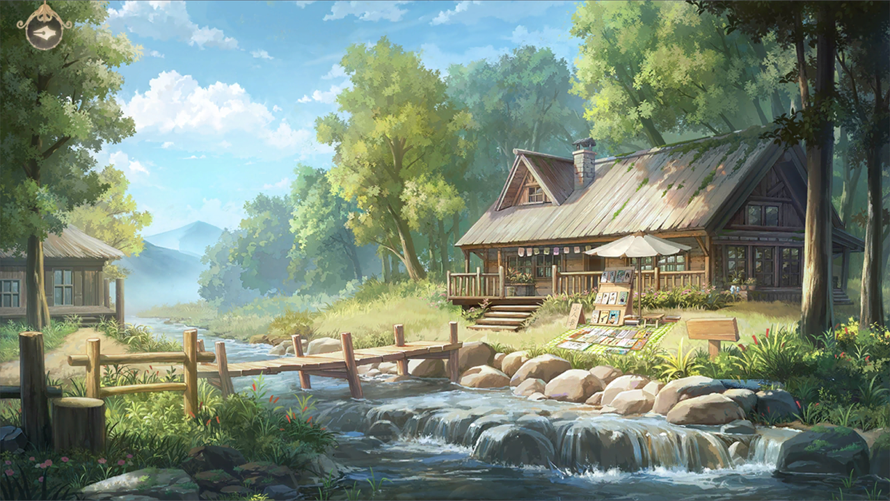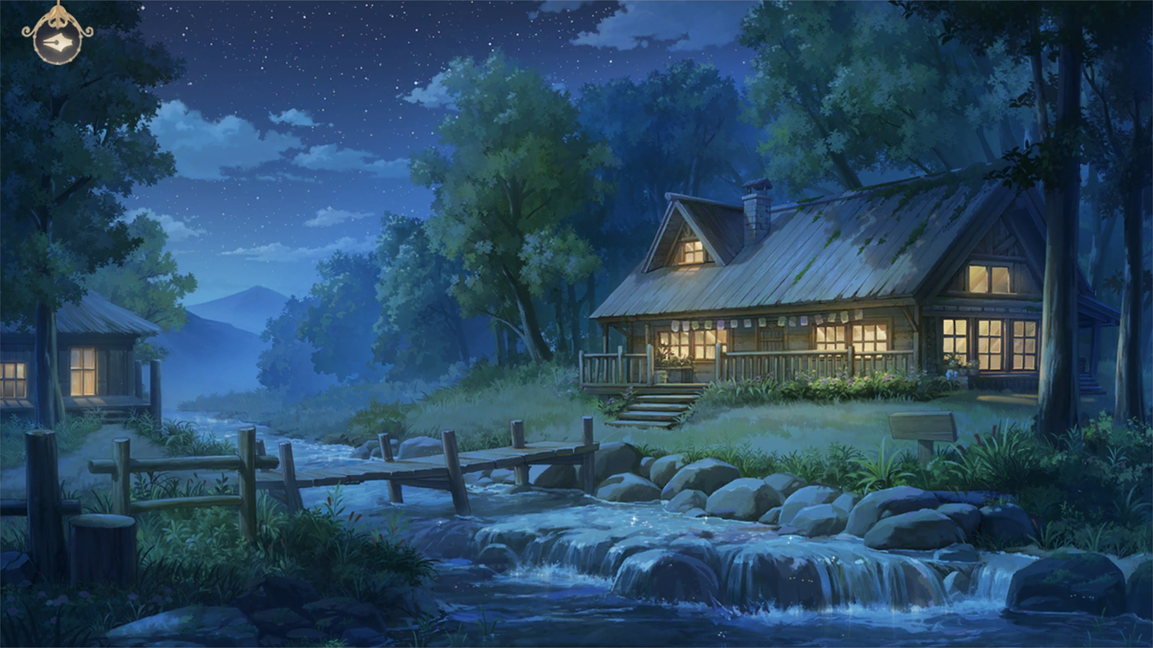 一行人跟着小光踏过木桥,来到小屋前。일행은 샤오광을 따라 나무다리를 건너, 오두막 앞에 도착했다.